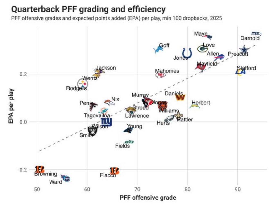 I never understood why the midget Kyler Murray is the franchise guy at Arizona. Prescott is having a season, but if they make it to the playoffs all will depend on how he does then. And of course, if they don’t make the playoffs then there you go. Did not see Maye having this type of a season. Looks like Billichick left a touch early. Jones is the biggest surprise imo.