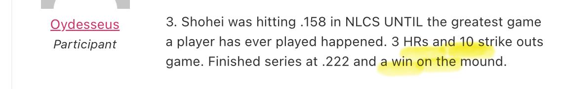 3. Shohei was hitting .158 in NLCS UNTIL the greatest game a player has ever played happened. 3 HRs and 10 strike outs game. Finished series at .222 and a win on the mound.