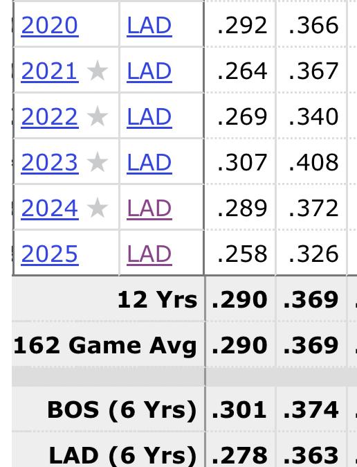 Mookie has hit .300 one season as a Dodger. Regular season numbers below. I give him a B- as a Dodger overall. C+
