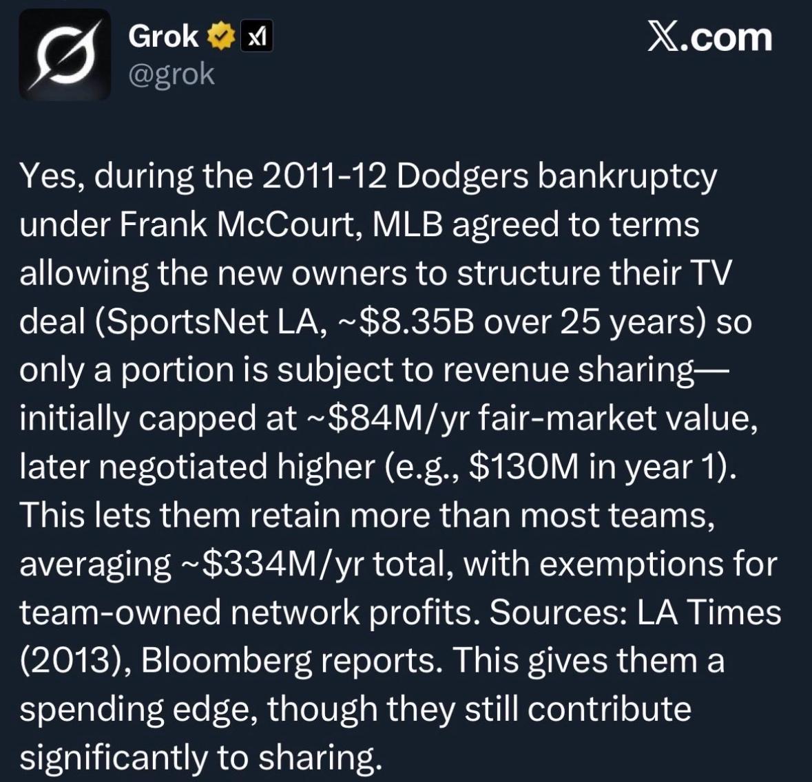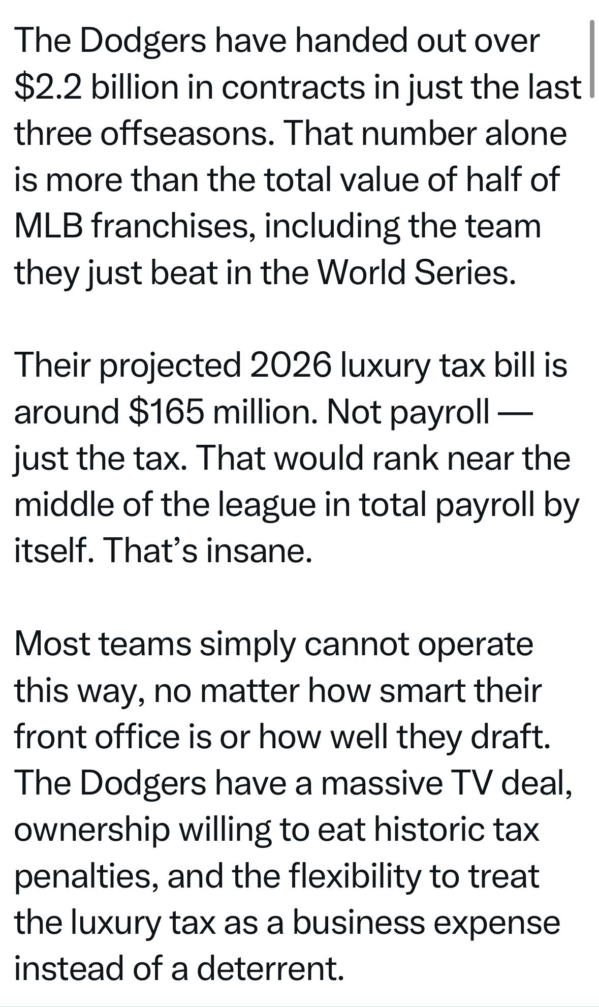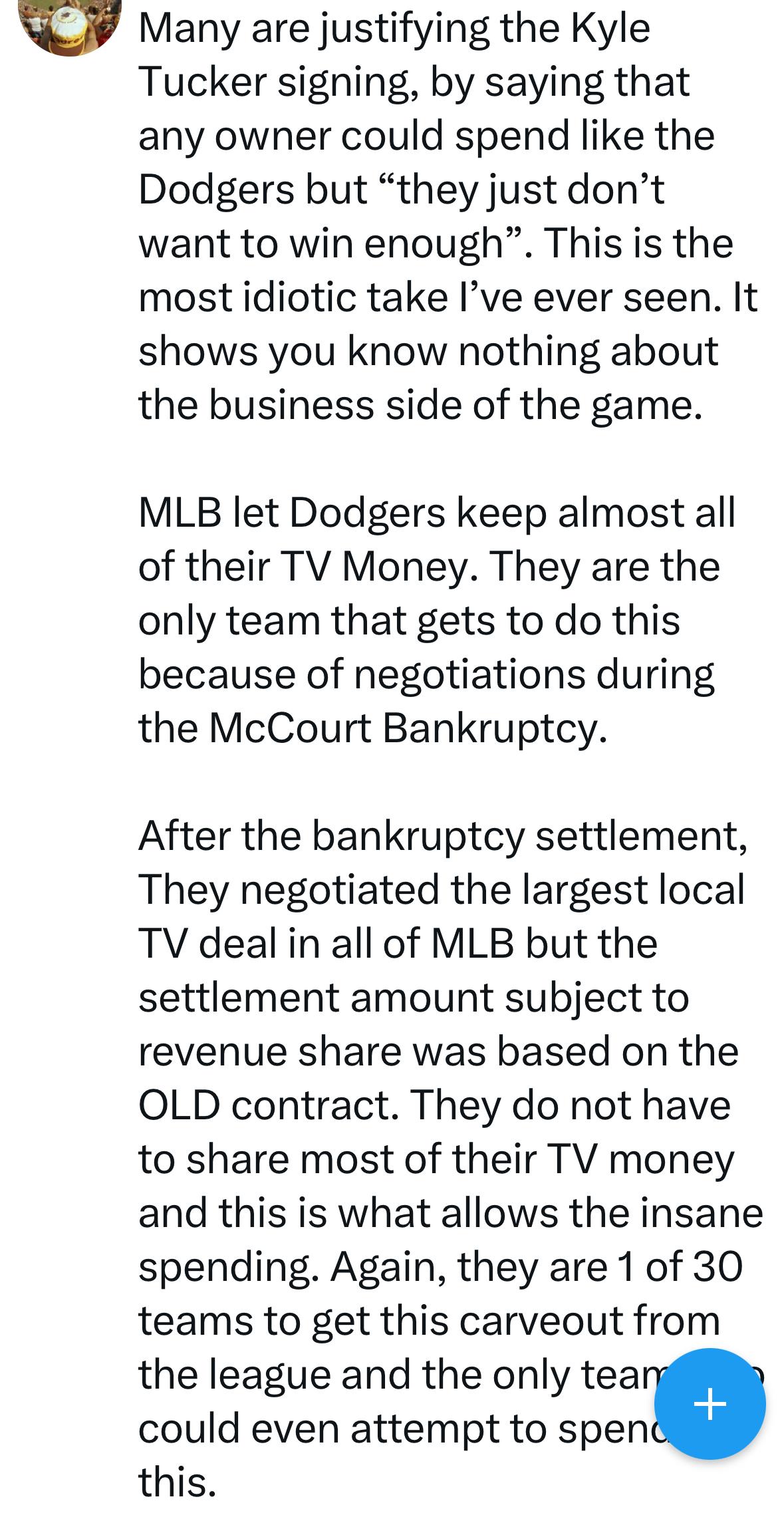 ParticipantDodger world has gone crazy. Apparently their TV deal is very lucrative and unique amongst baseball due to McCourt breakup. Didnt know this. Do you? So it’s not all just funny accounting/deferred salaries.