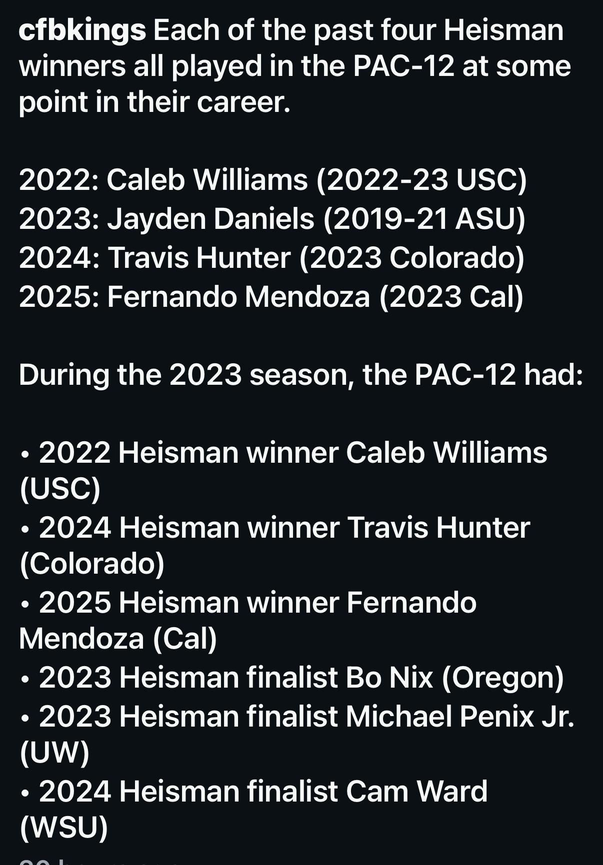 ParticipantThe PAC never got the respect it deserved. USC and the 11 dwarves was the how the conference was described. Unfortunately for the Pac, USC hit the skids after the snactions and no one else in the conference could carry the banner enough to garner big money broadcast rights. Oh, Oregon tried its very best, but bless their hearts they can’t win a national championship. Zero. Just flash. Big hat, no cattle. Huggy Bear pimp suit and shoes but no hoes. Not like us. ‘Ships, Heismans, Rose Bowls, athletes. We carried that freaking conference on the national stage forever and Oregon couldn’t do it while we were being held down by the ncaa. I sure do miss the bay area and zona roadies though.