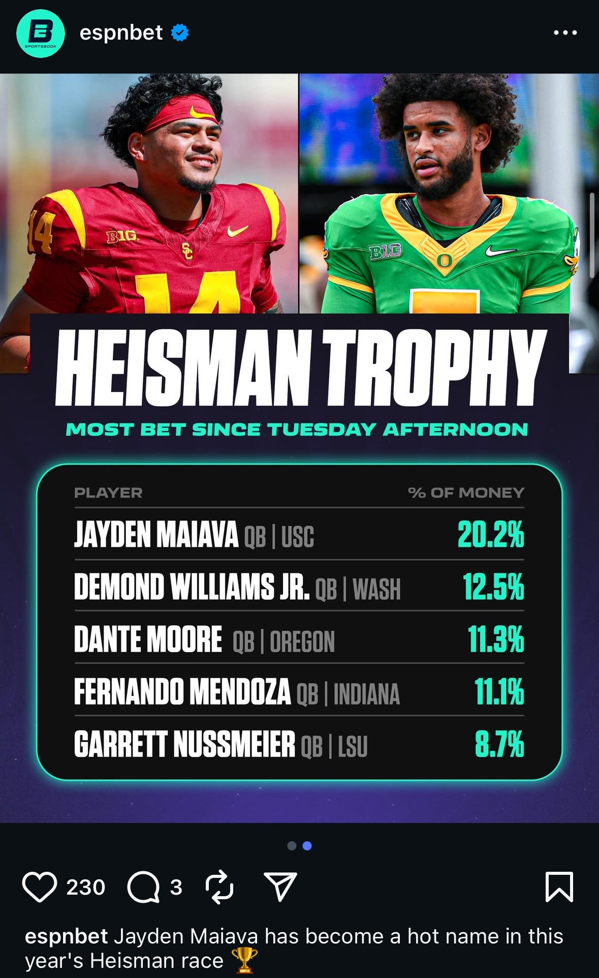 I have read that this is a weak year for QB’s coming out of college and as we all know a QB almost always wins the Heisman. I think the early betting money wants in on the Maiava odds with the expectation they won’t get better betting odds on him than now. If he starts dominating in the stretch of games USC has coming up the odds will tilt and the payouts won’t be as big. Riley and his offense have a history of showcasing the QB. Maiava has talent around him too. The running game is going to give him some big opportunities to shine. The OL too, Maiva has only been sacked once so far (Purdue)