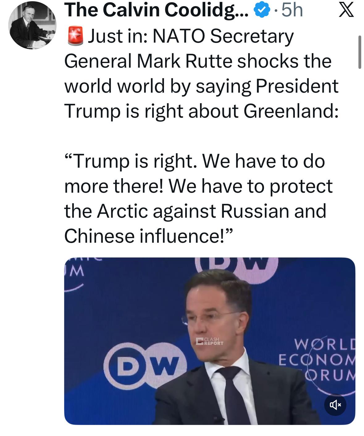 Seems like today’s events regarding Greenland suggest Trump agreed to take the military option off the table, as a negotiating tool, in order to advance the US’ negotiating position. I think the big NATO nations were humiliated by Trump’s aggressive stance, and didn’t want to appear like they were cowed by him. Looks like the parties are headed towards a deal.