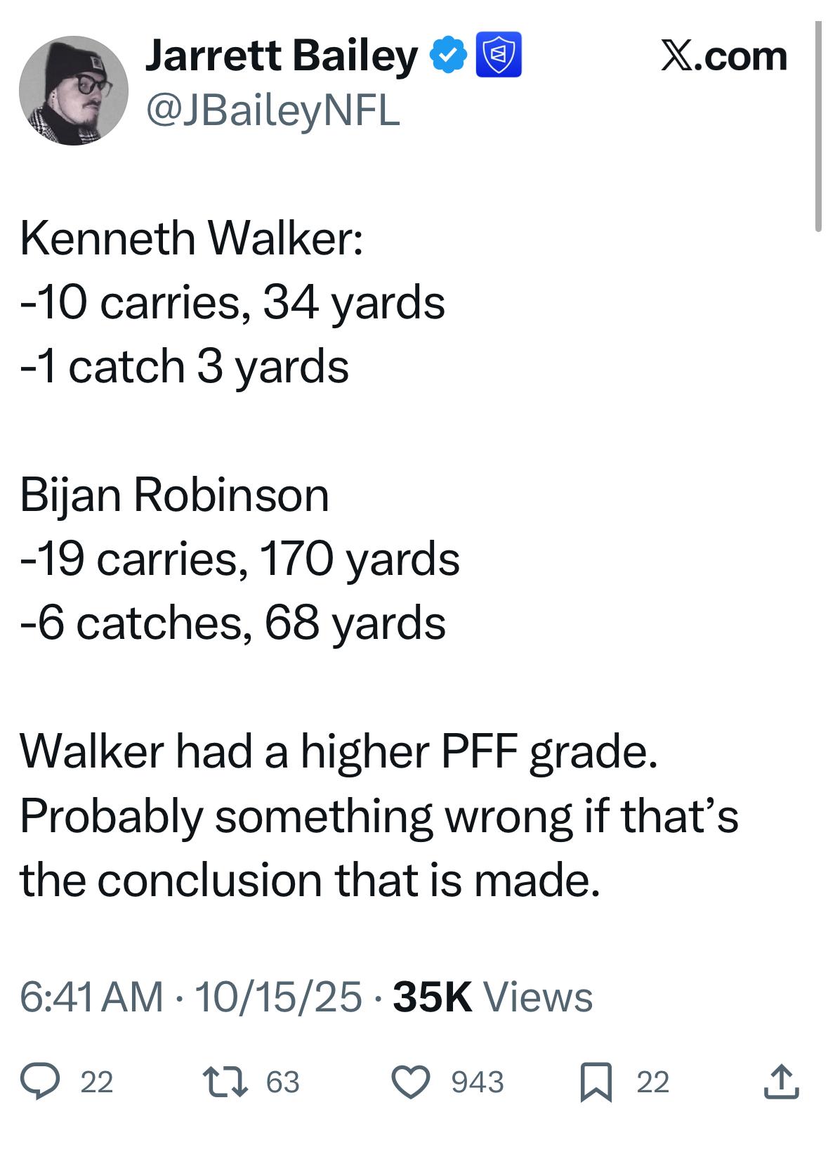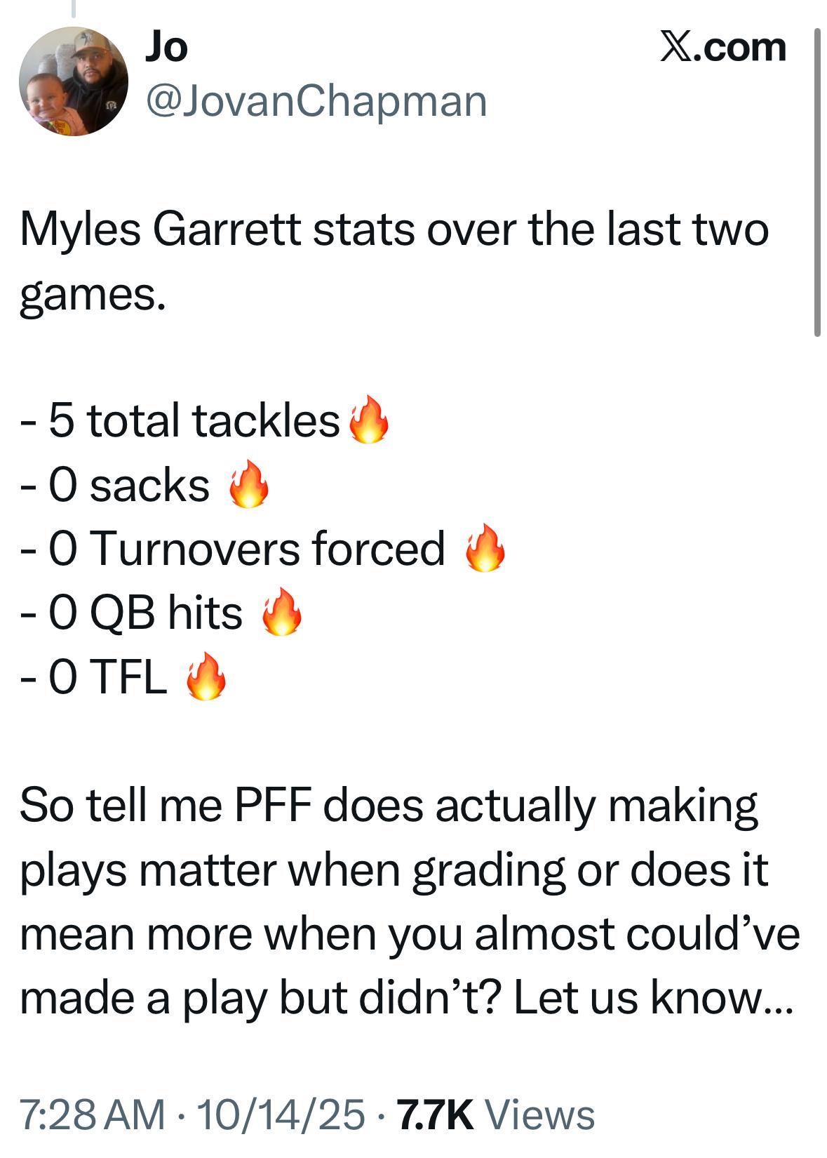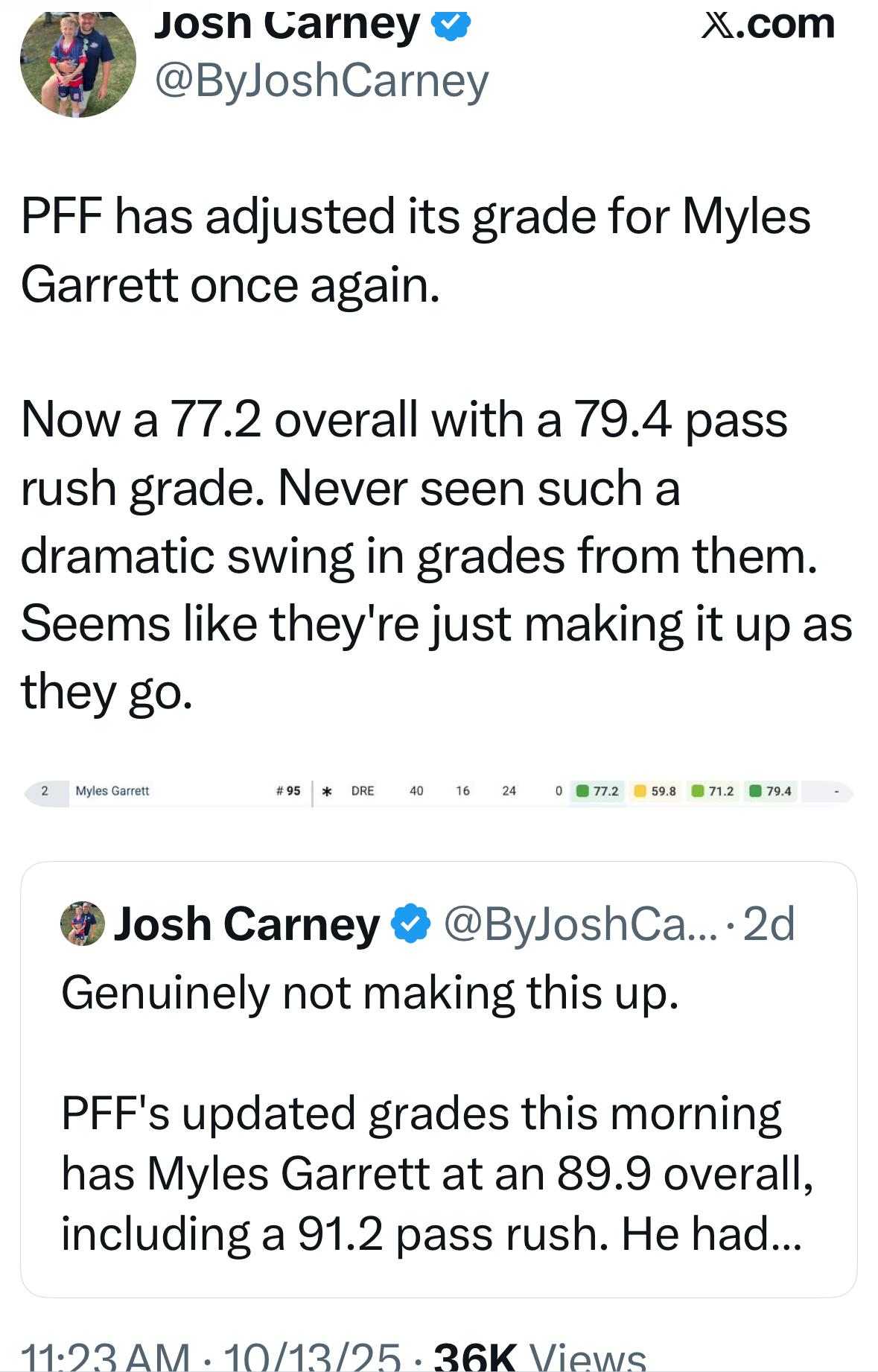 As it should. They attempt to grade every player/every snap for every game. It’s a big task. But like everything it gets “political”. Myles Garrett had one QB hurry in the game against Pittsburgh with no sacks or no tackles and was graded over 90%. It screams BS. It’s getting exposed