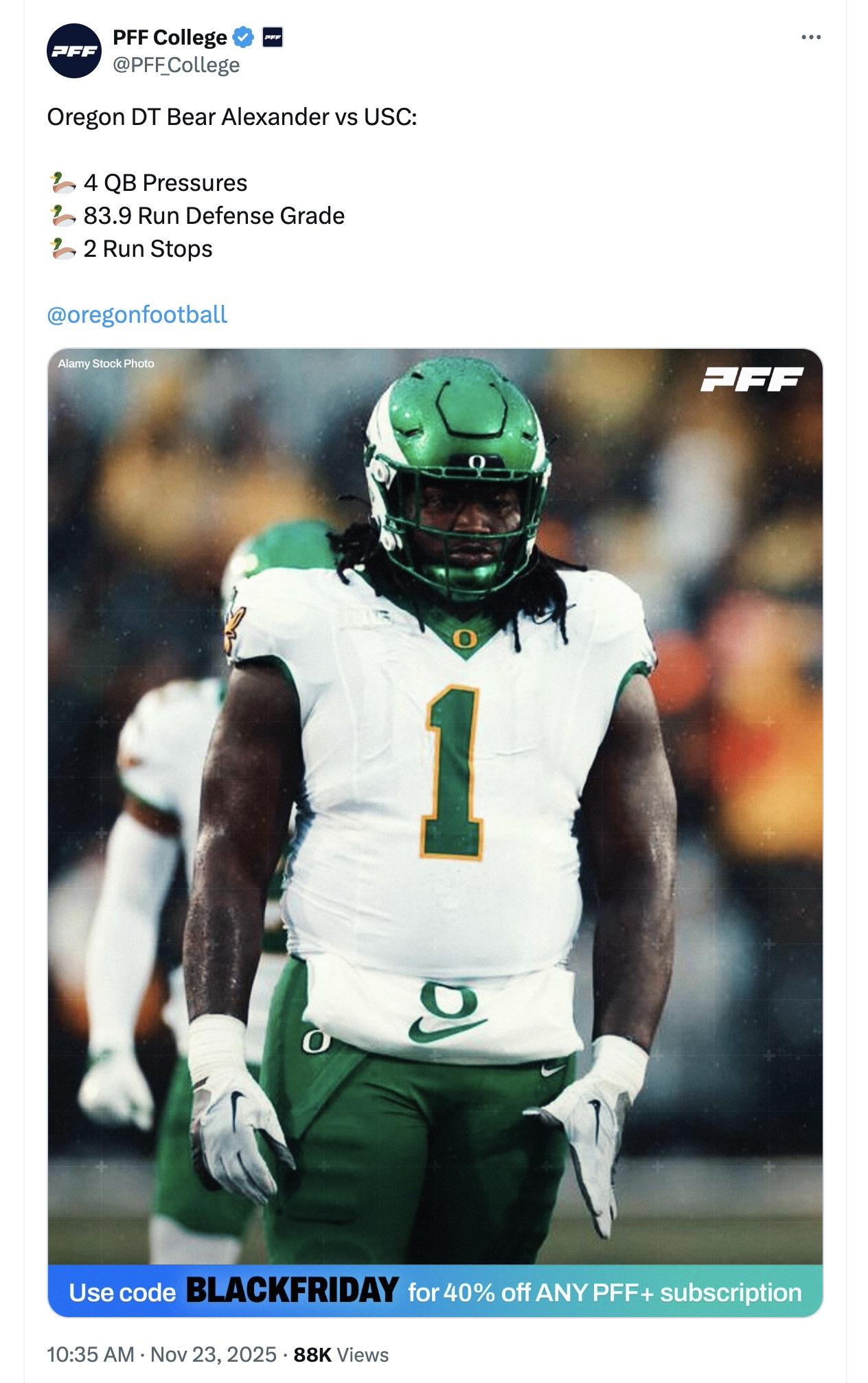 Hats off to Bear, he played well, very disruptive. But, many of us wanted him gone, he had a bad attitude while he was here. Good for da Ducks he has paid off for them. Hell, Oregon’s front 7 played great; they stuff USC’s run game = 61 yds, harass Maiava all day. USC has a lot of catching up to get into the Top 10.