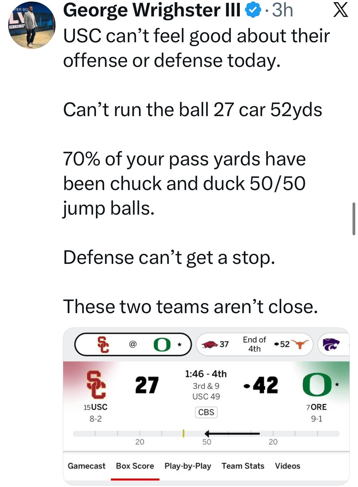 Oregon has the top ranked pass defense in the nation.  The nation.  And USC absolutely shredded it.  With no run game.  The USc d controlled the Oregon passing game pretty well and got a TO.