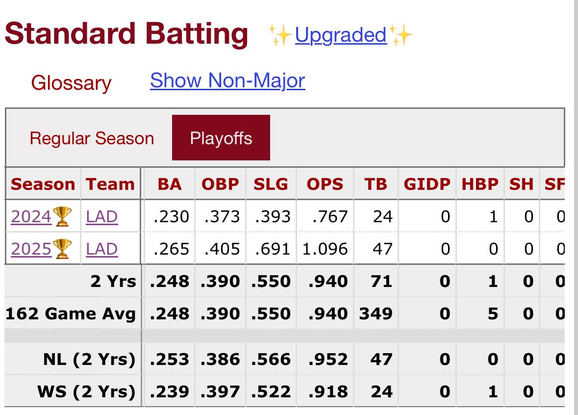 OBP   405.   3 doubles.  1 triple.  8 HR (tied Dodger franchise record for a post  season  2nd all time). 14 RBI 1.1 OPS.  Insane. Against the best teams in the world.  That extrapolates to about 76 HR and 135 RBi in a full season