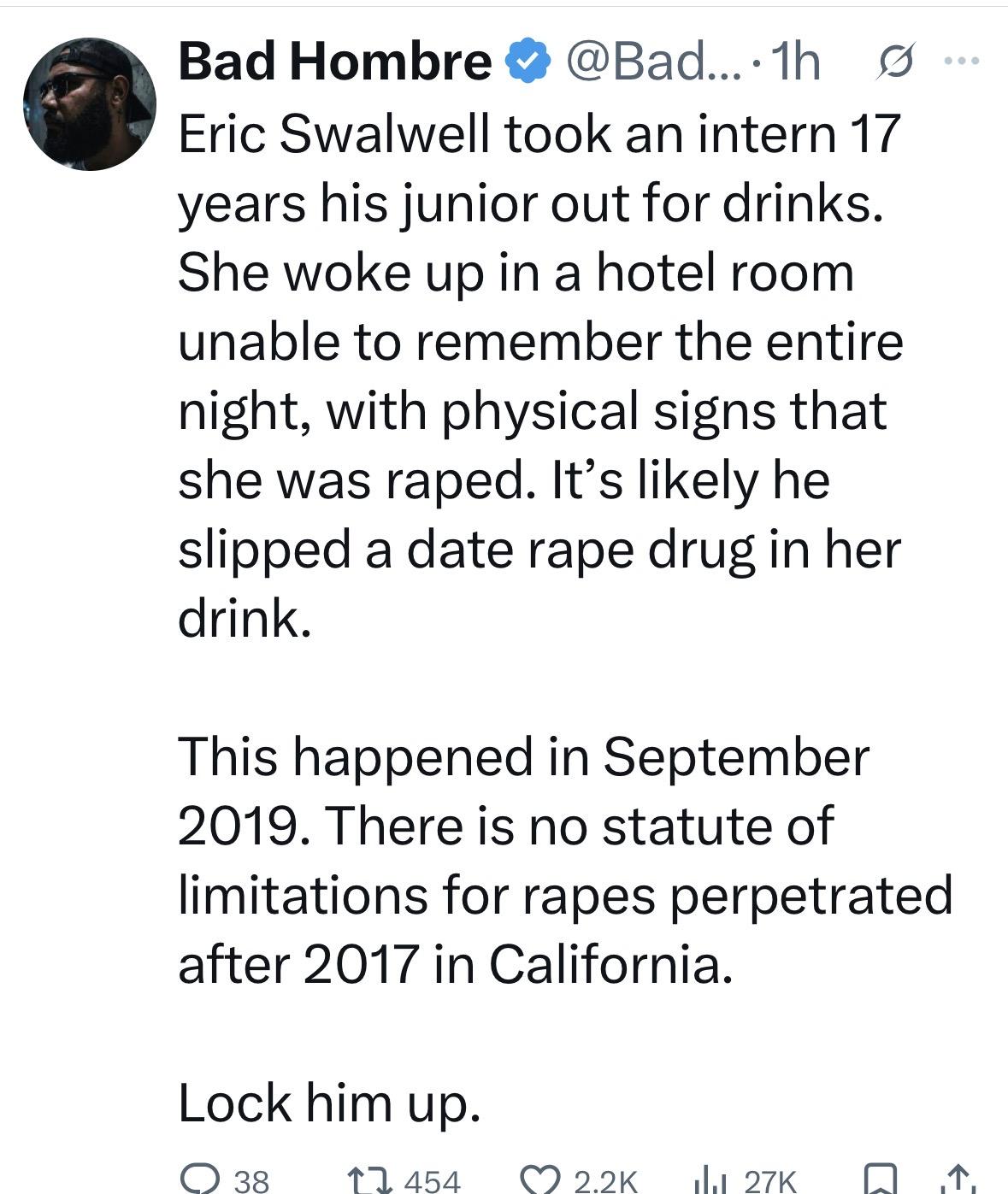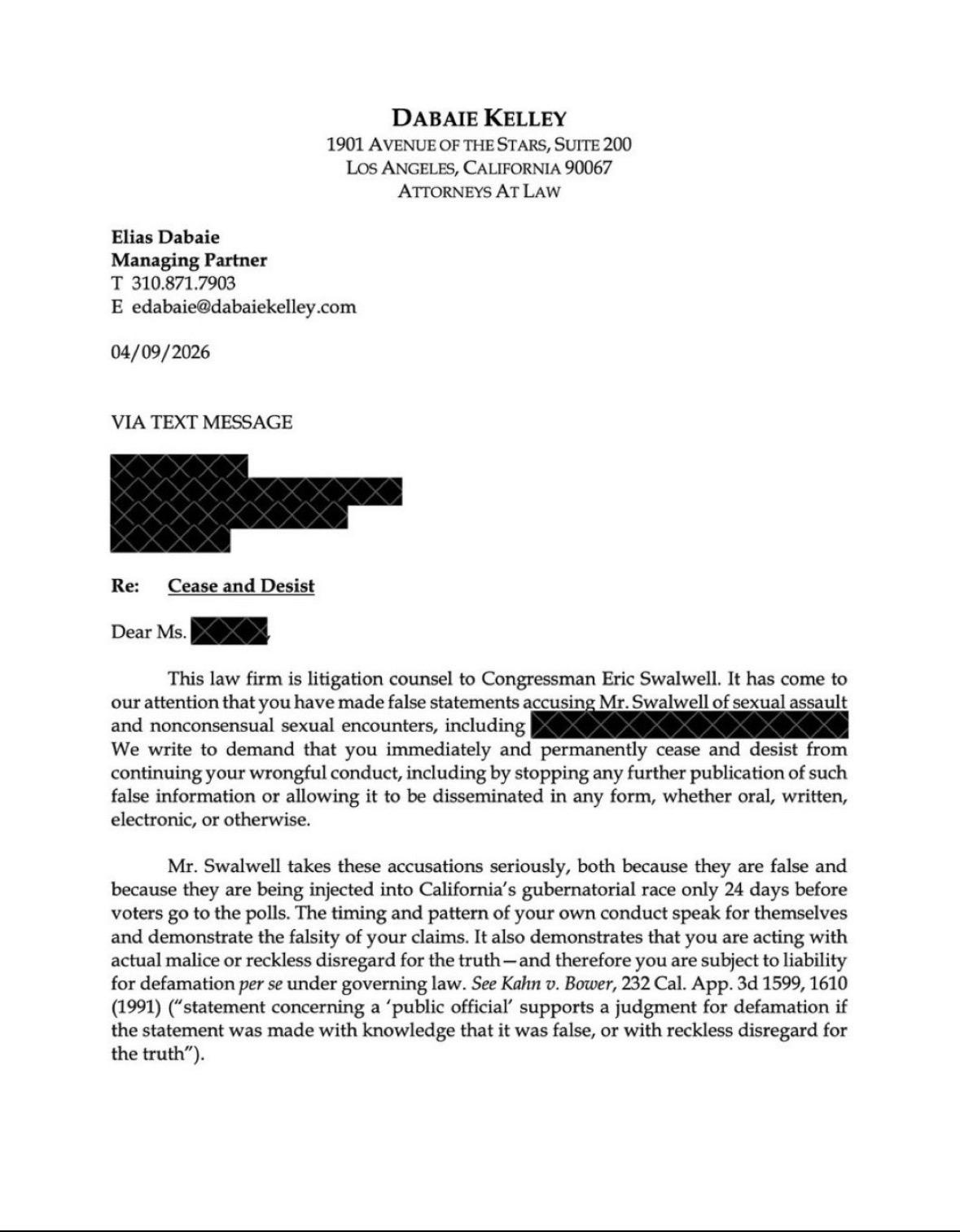 Swallwell sent a cease and desist letter. My goodness. Thats a bad look for a congressmen who says he defends women.