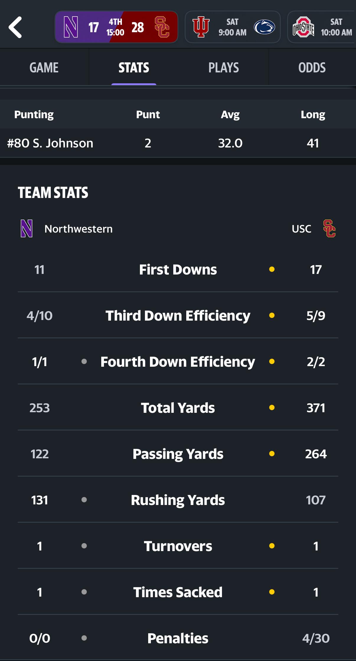 USC now with 253 yards passing and 107 rushing. 360 offense in a grinding game this early looks good NW is 208 Starting to get separation