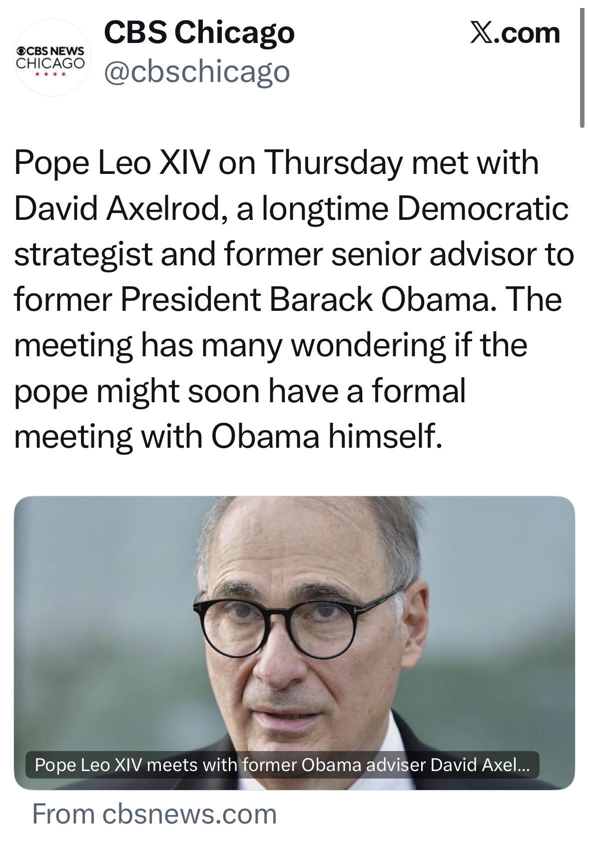 Lol Marxist pope entertains Obama’s hatchet man Axelrod this week and cardinals are interviewed by 60 minutes.